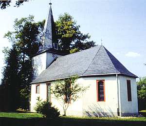 Eine uralte Sandstein-Altarplatte gibt Auskunft über die einzelnen Kirchenbauten. Wohl deren drei wurden in verschiedenen Epochen dem gedrungenen Turm angefügt. Der erste bereits 1309 - seine im römischen Verbund gemauerten Wände und ein Traßkalkboden kamen bei Grabungen ans Licht. Die zweite Altarplatten-Jahreszahl, 1501, wurde ebenfalls durch bei Grabarbeiten gefundene Mauerreste bestätigt. 1707 schließlich mußte das Langhaus wegen Baufälligkeit niedergerissen und von Grund auf renoviert werden. Es entstand ein äußerlich unscheinbares Kirchenschiff aus verputztem Bruchstein (Länge 15,70 Meter, Breite 7,95 Meter) mit dreiseitigem Chorabschluß. Sieben Fenster sorgen für den Lichteinfall. Über der zweiflügeligen Eingangstür ist das Baujahr 1707 eingemeißelt.