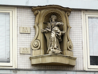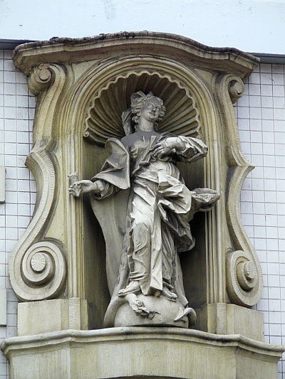 An dem 1965 erstellten Neubau wurde vom Vorgängerhaus die spätbarocke, angeblich 1765 angefertigte Sandsteinfigur einer Immakulata in einer barockisierend nachempfundenen Nische wieder angebracht. [1]