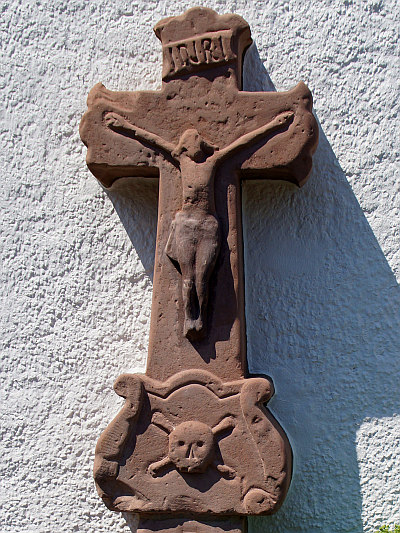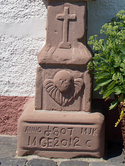 In der Büscheicher Straße, steht dieses Sandsteinkreuz an einer Hauswand, mit der Inschrift: