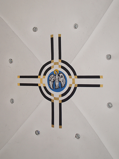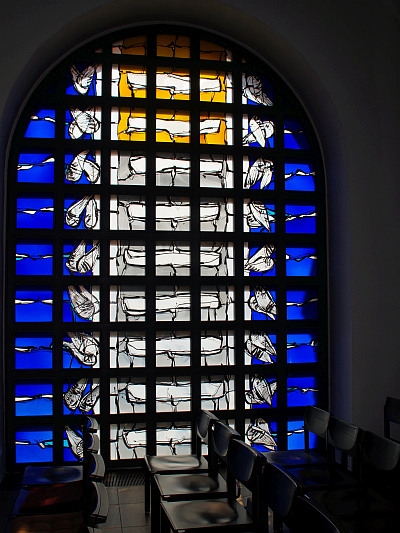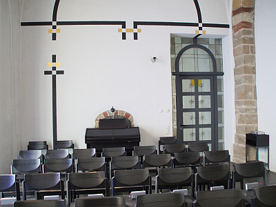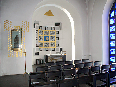 Der östlich offene Turmbogen wurde mit einer Apsis geschlossen. Diese ist durch ein Lichtband wirkungsvoll vom Mauerwerk des Turmes optisch getrennt. Damit wurde dem Raum wieder seine ursprüngliche Orientierung gegeben. Den seitlichen Turmbogen schloss der Künstler durch eine großflächige Fensterwand, durch die das in den Farben des Fensters gebrochene Licht, eine meditative Atmosphäre im Raum schafft. Dem Fenster liegt das biblische Motiv der Jakobsleiter aus dem Alten Testament zugrunde.