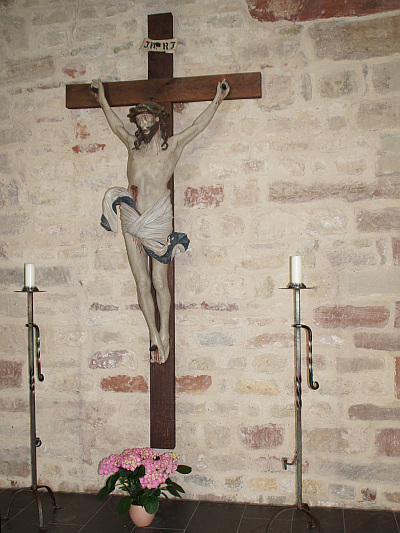 Die Ausmalung der Apsis konzentriert sich mit Motiven aus der Offenbarung des Johannes auf die Mitte, den Christuskopf, eine Kalksteinskulptur in Überlebensgröße, die noch den großflächigen Stil spätantiker Plastiken besitzt und nach Meinung der Fachleute vielleicht zusammen mit anderen Plastiken einst das Portal der romanischen Kirche schmückte.