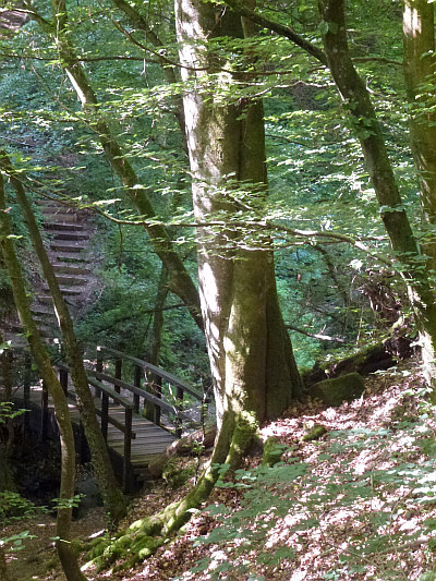 Der Stamm ist in sich stark gedreht und ist wie die hochreichende Krone in einem sehr guten Zustand. Talseitig freiliegendes Wurzelwerk.