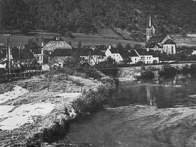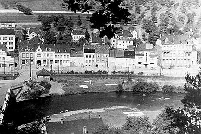 Auf der Kyllwiese am Bahnübergang liegt die Leinenwäsche der Metzgerei Roth (heute Endres) noch auf der Bleiche, und man erkennt auch die Wasserentnahmestelle an der Kyll zum Begießen der Tücher. [1]
