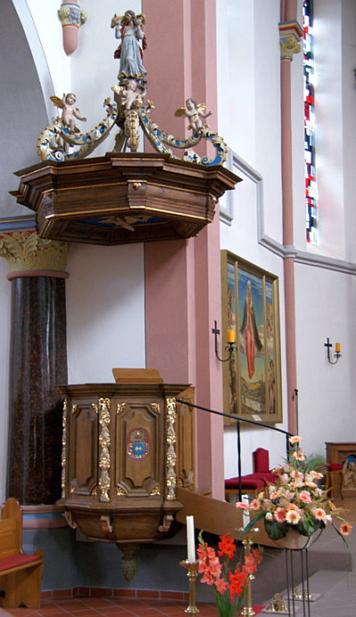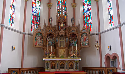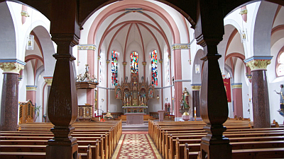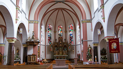 Neuspätromanische Schieferbruchstein-Basilika, 1906, Westturm von 1725; vier Pfarrergrabsteine, 19. Jahrhundert, steinernes Drehtabernakel. [1]