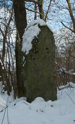 er als Hinkelstein (K.D.) eingezeichnet. In der Nähe steht auch noch ein Jagdhaus. Der Stein ist knapp 2 Meter hoch, leicht zur Seite nach rechts geneigt und wirkt sehr stattlich. Die Vorderseite ist relativ glatt, während die Rückseite eine rauhe Oberfläche aufweist. Deutlich erkennbar sind einige querlaufende Quarzadern im Gestein. Man fühlt beim