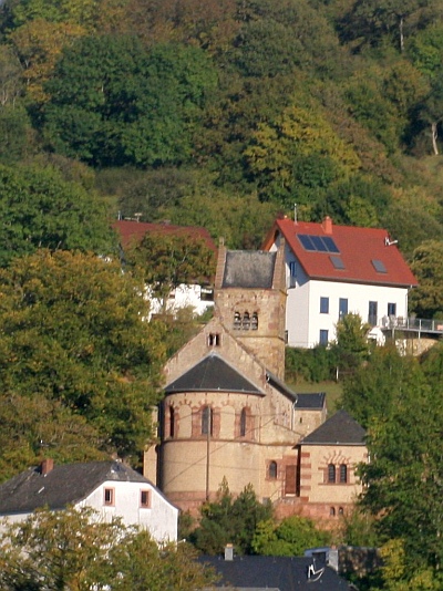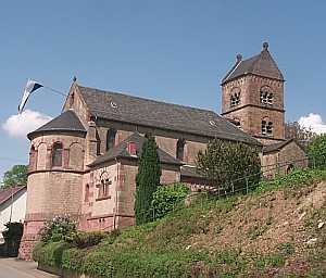 Einen romanischen Ostquerbau (s. Eintrag romanische Kirche) einbeziehende doppelchörige, flachgedeckte neuromanische Basilika von 1901/03. Die Kirche ist die Rekonstruktion einer romanischen Basilika, die 1630 durch einen schlichten Saal ersetzt wurde. Bau nach Plänen des Trierer Dombaumeisters Reinhold Wirtz (bis 1898) und seines Nachfolgers Dombaumeister Wilhelm Schmitz. Die Einzelformen der Basilika sind der Hochromanik nachempfunden. Ausmalung von 1928. [2]