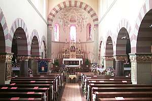 Von einer dreischiffigen Basilika um 1100 blieb nur der Ostbau erhalten. Langhaus 1901 durch Dombaumeister Wilhelm Schmitz in neuromanischen Formen errichtet. [1]