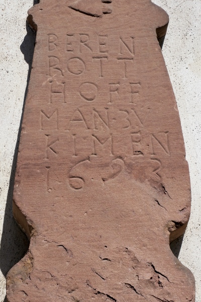 Schlichtes Schaftkreuz aus Rotsandstein, 1948 samt Setzstein in das Nebengebäude eingemauert. Der sich an den Seiten verjüngende Schaft trägt die Stifterinschrift BEREN ROTT HOFMANN ZV KIMEN und die Berufszeichen Mühlenhammer und Pflugschar. In der Mitte des schlichten Balkenkreuzes ist eine Nische eingelassen.
