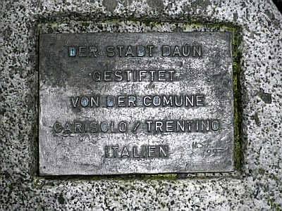 Interessant ist die Entstehungsgeschichte des markanten Brunnens: 1983, anlässlich des 100 - jährigen Bestehens der Dauner Freiwilligen Feuerwehr, fand ein Luftballonwettbewerb statt. In Carisolo/Trentino, nördlich des Gardasees, landete der am weitesten geflogene Ballon; ein Mädchen dieser Stadt sandte die Grußkarte zurück. In der Folge entwickelte sich ein Kontakt von Feuerwehr zu Feuerwehr, gegenseitige Besuche und Geschenke vertieften die Freundschaft.