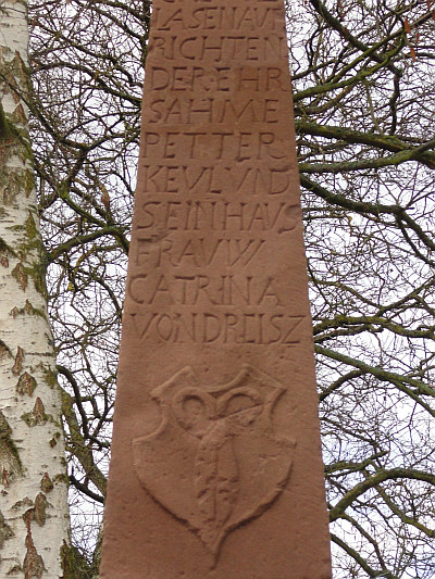 Darunter ist ein Wappenschild mit einer Schere eingearbeitet, dem Berufszeichen des Schneiders. Ein unscheinbares Steinmetzzeichen oberhalb der Jahreszahl verrät die Herkunft aus der bekannten Werkstatt der Gebrüder Wolff in Wittlich. [1]