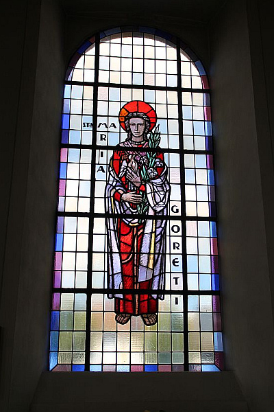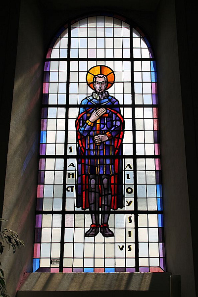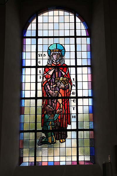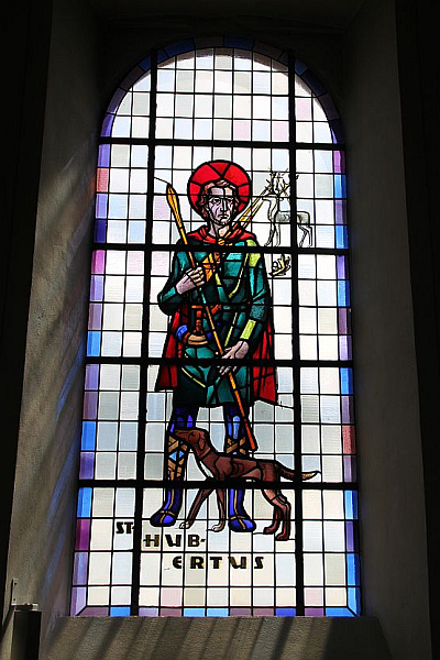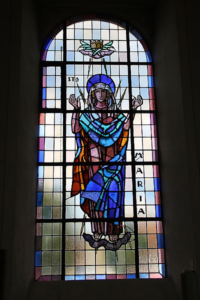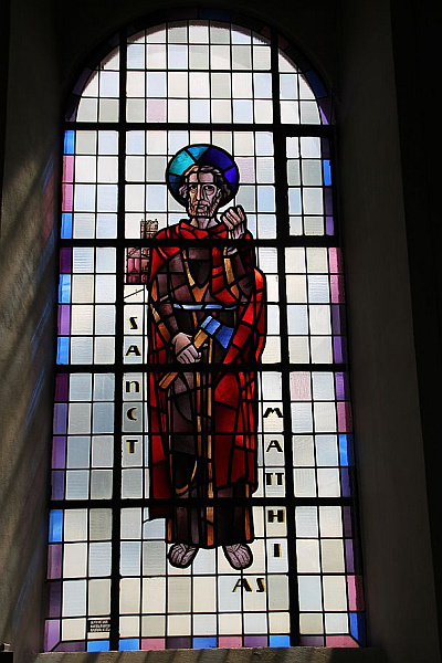 [...] Die Fenster der Frauenseite schmückten Bilder der heiligen Agnes, Maria Königin und der heiligen Elisabeth, die der Männerseite Aloysius, Christkönig und Hubertus. Zwei im Altarraum gegenüberliegende, durch eine Säule geteilte Bogenfenster wurden von Symbolen der vier Evangelisten bestimmt. Das linke und rechte Fenster im Eingangsraum hatten keine Widmung. Alle Fenster sind durch Kriegseinwirkung im 2. Weltkrieg zerstört worden. Heute sind auf der linken Seite die heilige Maria Goretti, die heilige Maria und die heilige Elisabeth von Thüringen zu sehen. Auf der rechten Seite findet man den heiligen Aloysius, dem heiligen Hubertus und unseren Bistumsheiligen Matthias. Die Fenster auf der linken Seite wurden durch Haussammlungen finanziert, die auf der rechten Seite sind Stiftungen (siehe Stiftermarken!). Die Altarraumfenster zu beiden Seiten sind zugemauert worden. Es bleibt zu hoffen, daßsie im Zuge der geplanten Restaurierungsmaßnahmen in alter Form wiedererstehen. [1]