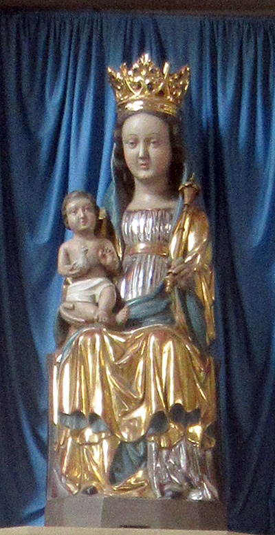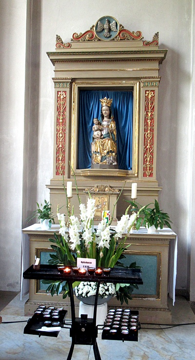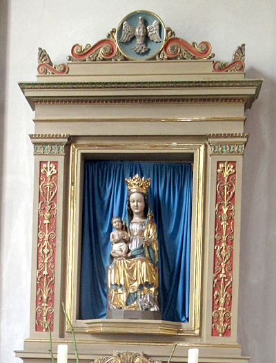 In der Nische des linken Seitenaltars ein altes Gnadenbild: Holzfigur der Mutter Gottes, mit dem Kinde im rechten Arm, das Szepter in der Linken, mit dem Fußstück des angedeuteten Thrones 1 m hoch, erste Hälfte des 14. Jahrhunderts. Das Kleid noch symmetrisch und stufenförmig geordnet bei der breit gehaltenen Faltengebung, hochgegürtet und eng geschlossen. Der hochgezogene Mantel läßt vorne das lang herabfließende Haar frei. Das Antlitz ist bei der Neufassung stark geglättet worden. Das nur Lendentuch bekleidete Kind kreuzt die Beinchen; es hält in der Rechten eine Taube, die Linke mit Redegestus. [1]