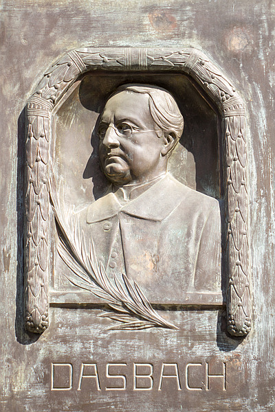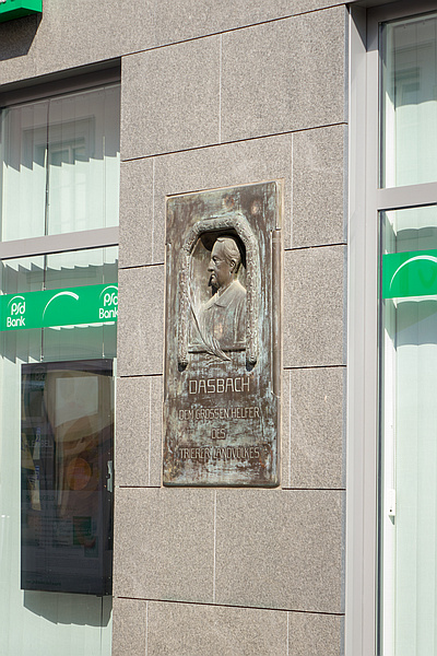 Die obere Hälfte der Bronzetafel wird von einem Reliefporträt Georg Friedrich Dasbachs (1846-1907) ausgefüllt. Das Dreiviertelporträt zeigt Dasbach im mittleren Alter, der in die Kleidung eines Kaplans gehüllt, mit ernstem Blick nach rechts gewandt, aus dem Bildwerk herausschaut. Georg Friedrich Dasbach (1846-1907) ist ein katholischer Kaplan, Publizist, Reichstags- und Landtagsabgeordneter, der maßgeblich zu verschiedenen sozialen Entwicklungen in Trier und der Umgebung beigetragen hat. Die untere Hälfte der Tafel wird von der Inschrift »Dasbach / dem grossen Helfer / des / Trierer Landvolkes« ausgefüllt. [1]