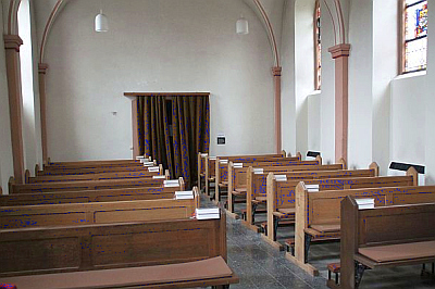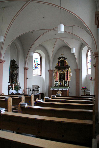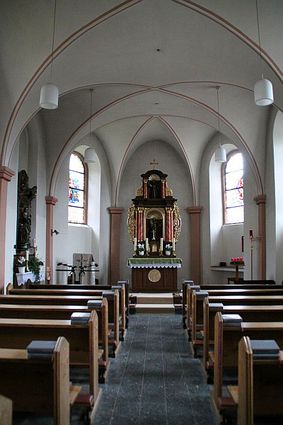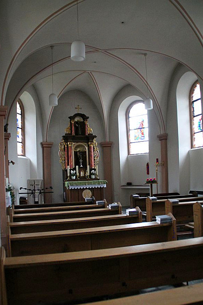 Der schlichte, dreiseitig geschlossene Saalbau wurde laut Türsturzinschrift im Jahre 1775 erbaut. Im Inneren findet man Kreuzgratgewölbe über rechteckigen Wandvorlagen. Das kleine Altarretabel stammt aus dem 18. Jahrhundert.