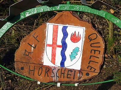 Das am 7. Mai 1991 genehmigte Wappen wird wie folgt beschrieben: "In Silber ein blauer Wellenstab, vorn ein durchgehendes rotes Balkenkreuz, hinten über einem grünen Eichenblatt eine rote Flamme." Das rote Balkenkreuz auf silbernem Grund weist auf die jahrhundertelange Zugehörigkeit zum Kurfürstentum Trier hin. Der blaue Wellenstab symbolisiert die Quelle des Alfbachs. Das grüne Eichenblatt dokumentiert, dass der Name Hörscheid als "Bergwald" gedeutet wird, sowie die Tatsache, dass auf der Flur Gebrannter Berg Eichenlohe zum Gerben gewonnen wurde. Die rote Flamme ist Kennzeichen der Ortspatronin Sankt Brigida. [1]