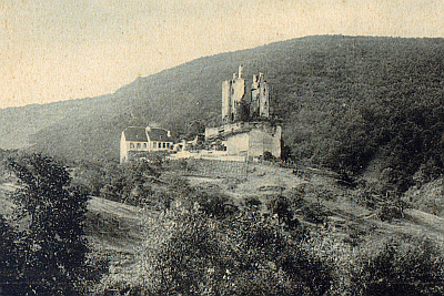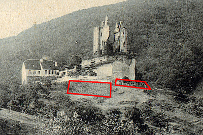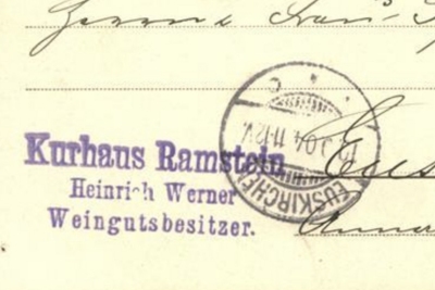 Auf der Ansichtskarte, die am Freitag, den 10.08.1906 in Cordel abgestempelt wurde und nach New York ging, sind unterhalb der Burg Ramstein zwei Rebflächen zu erkennen. [1]