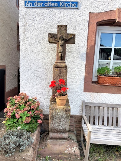 Vor der linken Hausecke steht ein gedrungenes Schaftkreuz ohne Inschrift. Am hohen Sockel wuchtige Kons ole zum Absetzen der Monstranz, darüber auf der Vorderseite des niedrigen Schafts eingeritzt deren Abbild. Kein Kapitell, das am unteren Ende beschädigte Abschlußkreuz steht auf einer (nicht zugehörigen?) profilierten Basis. Die untypischen Formen erschweren eine Datierung, vielleicht erste Hälfte 18. Jahrhundert. [1]