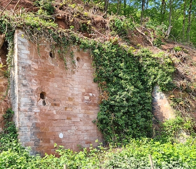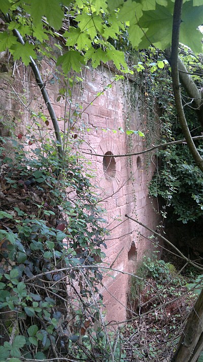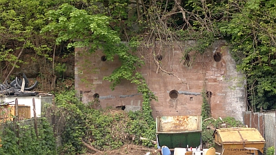 Tatsächlich fand ich nach Befragung von Anwohnern und Vorortsuche 3 Eingänge. Diese Leute haben als Kinder nach dem Krieg noch in den Räumen gespielt. Ursprünglich sollen es Keller der nahegelegenen Kasernen (Anfang 1900) gewesen sein. Dann wurden diese Räume während des Krieges großzügig zu Schutzräumen erweitert und eingerichtet. Die Gänge sollen dann mindestens 50 m weit in den Berg getrieben worden sein. Ähnlich der Biewerer Anlage gab es eine größere Anzahl von Räumen für die Unterbringung der Anwohner. Später wurden die Anlage durch Sprengungen verschüttet. [1]