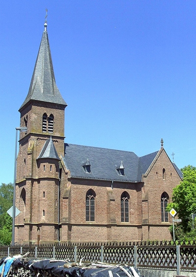Der heutige Kirchbau wurde 1895 / 97 vom Trierer Dombaumeister Wirtz an anderer Stelle errichtet. Für den Saalbau mit vorgelegtem Westturm, Treppentürmchen, Querhaus und eingezogenem Chor mit Fünfachtelschluss wurden Quader des heimischen, roten Kyllsandsteins verwandt. Der Außenbau ist in der Vertikalen durch abgetreppte Strebepfeiler und durch Spitzbogenfenster mit Maßwerk aus zwei Lanzetten und Dreipaß und in der Horizontalen durch den umlaufenden Sockel, das Sohlbankgesims und ein schön gekehltes Traufgesims gegliedert. Die Einzelformen des Außenbaues sind Vorbildern des 13. Jahrhunderts entlehnt. Ein dreifach abgetreppter Blendbogen mit dreibahnigem Maßwerkfenster und Portal vermittelt zum Inneren.