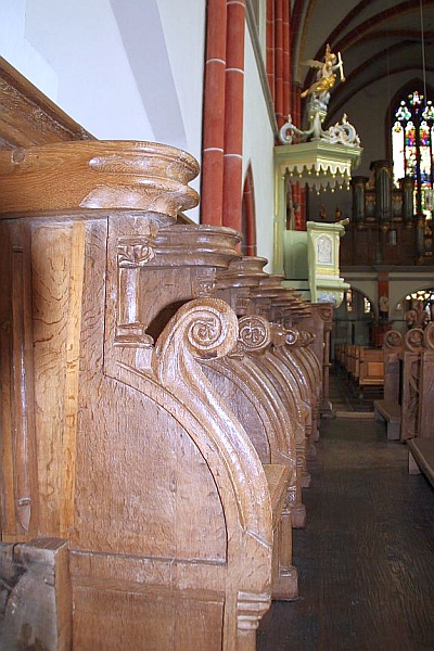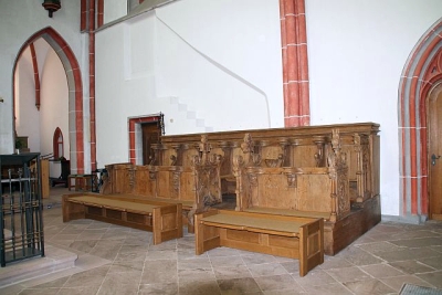 aber handwerklich-gediegenen, gut erhaltenen Chorgestühls mit je sechs Sitzen (ein siebter Sitz im Eingang kann höchstens als Reserve dienen), das in die 1. Hälfte des 14. Jahrhunderts (vielleicht etwas zu früh) datiert wird. Als Herkunft wird das