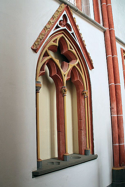 Dreisitz und ist wie dieser aus der Bauzeit. Stilistisch ist sie aber als Dreieck - ähnlich den Chorfenstern - zweigliedrig mit Vierpaß gestaltet und 47 cm tief. Die Piscina dient der liturgischen Händewaschung vor bzw. während der Messe, nach Salbungen und z. B. nach der Spendung des Aschenkreuzes am Aschermittwoch und nach der Fußwaschung am Gründonnerstag, aber auch zur Reinigung der eucharistischen Gefäße. Deshalb befindet sich auf der rechten Seite der Nische im Boden ein kreisrunder Ausguß, ursprünglich mit einem kleinen Abflußkanal. [1]