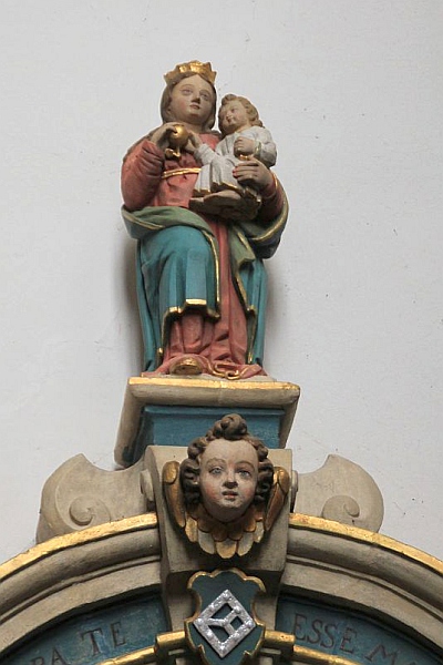Die zweite Ergänzung sind drei kleinere Figuren um den Rundbogen, oben eine Madonna mit Kind, über dem rechten Pilaster Johannes der Täufer.
