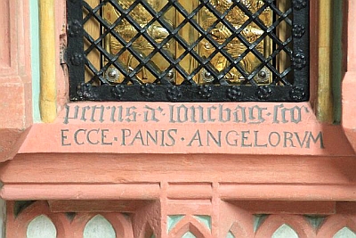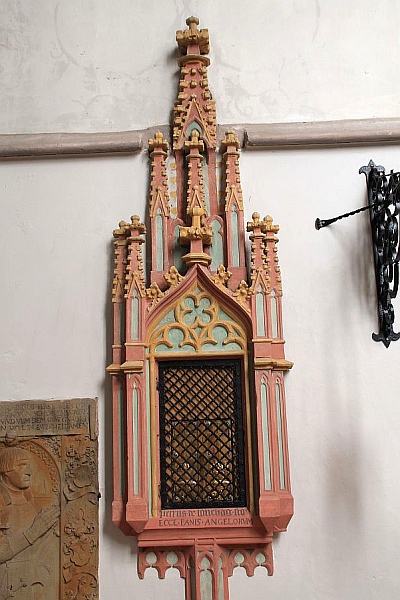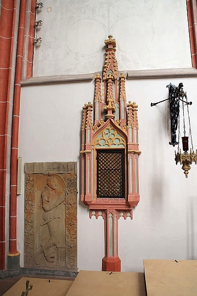Spätgotisches Sakramentshaus (Wandtabernakel), links davon das Epitaph des knienden, 1540 gestorbenen Johann von Schönenberg und rechts das 1630 von Hugo von Schmidtburg gestiftete kleine Pieta-Altarretabel. [1]