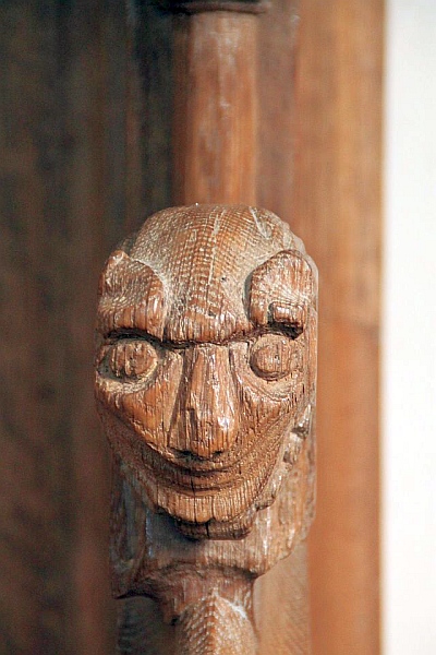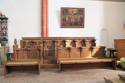 aber handwerklich-gediegenen, gut erhaltenen Chorgestühls mit je sechs Sitzen (ein siebter Sitz im Eingang kann höchstens als Reserve dienen), das in die 1. Hälfte des 14. Jahrhunderts (vielleicht etwas zu früh) datiert wird. Als Herkunft wird das