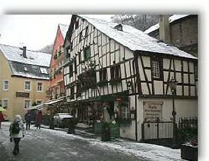 Dieses Doppelhaus mit seinem eigenartigen ineinandergreifenden Stockwerks-Eigentumsrecht, mit seinen verbogenen Tragbalken und dem bäuerlich-einfachen Ständerfachwerk, das rein konstruktiv und nicht dekorativ gedacht ist, ist der wuchtigste Wohnbau der an sehenswerten alten Häusern so reichen Stadt Bernkastel.