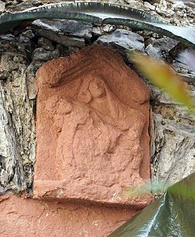 Über dem Keller Eingang des Wirtschaftsgebäudes ist eine kleines Bildwerk aus rotem Sandstein eingemauert, das die Gottesmutter mit dem Toten Sohne auf dem Schoß darstellt. Es ist nur 25 cm breit und 40 cm hoch und dürfte ein Teil eines kleines Bildstocks gewesen sein. Wird im Ort kaum beachtet, da es abseits der Straße in einem Hofraum sich befindet. [2]
