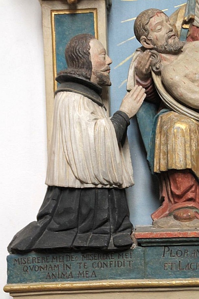 Schmidtburg: in Rot eine goldene Gürtelschnalle. Dieses Vesperbild wurde zu unterschiedlichen Zeiten ergänzt, zum einen um zwei in der Größe zur Pieta-Darstellung passende Figuren, rechts eine kniende weibliche Figur, Maria Magdalena, und links eine kniende männliche Figur in Chorkleidung, wohl der Stifter. Dazu passend drei Unterschriften: