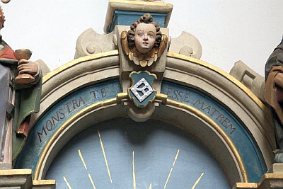 Im Rundbogen oben ein Wappenschild mit dem Wappen des Stifters Hugo