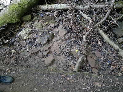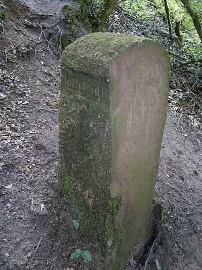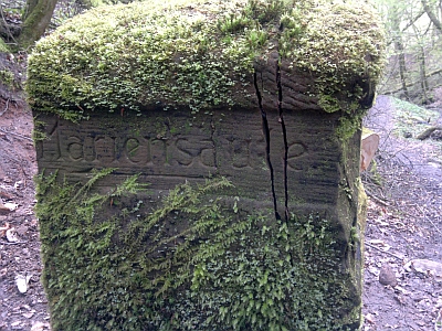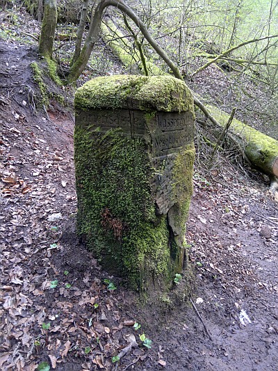 Wegestein im bizarren Tal des Sirzenicher Baches. Der Stein weist auf einen Weg zur Mariensäule aus dem Bachtal heraus hin, und dieser ehemalige Weg ist heute überhaupt nicht mehr erkennbar. Der Stein ist einem aktuellen Verfall preisgebeben. Die Bilder wurden im einem Abstand von nur wenigen Wochen gemacht. Die Spaltung wurde immer größer und nun [April 2017] ist ca. 1/3 des Steines bereits in Trümmern in den Bach gestürzt und z. T. weggespült worden.