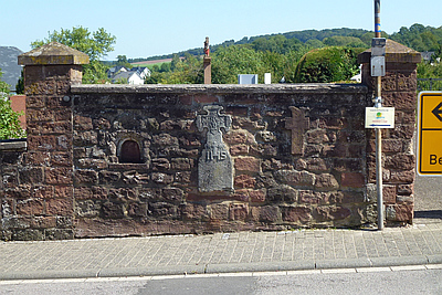 In der den Pfarrhof abtrennenden Mauer sind in großer Zahl Grabkreuze aus Sandstein eingelassen, überwiegend aus dem frühen 19.Jahrhundert. Die Form als Balkenkreuz mit eingekerbten Enden sowie die Ikonographie der Reliefdarstellungen (Arma Christi, Dornenkrone mit Herz und Kreuznägel, IHS-Zeichen und Totenkopf) sind Dokumente der Sepulkralkultur des gesamten 19. Jahrhunderts. [1]