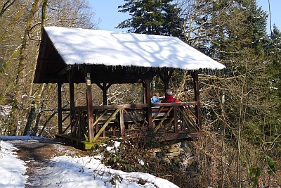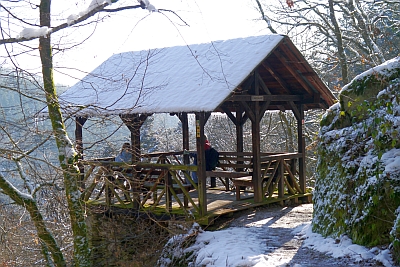 Die Robertskanzel am Lieserpfad nach Wittlich bzw. dem Eifelsteig, liegt auf einem Fels westlich und oberhalb des Burgweihers. Eine der vielen Schutzhütten rund um die Kurstadt Manderscheid, die den Wanderer zum Verweilen einlädt.
