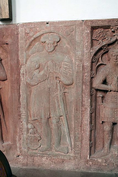 Flachrelief, stehende Figur, die einen Rosenkranz in betend erhobenen Händen auf "weichem Wams" hält, zur Seite ein Schwert. Rechts unten ein bürgerliches Wappen: eine umgedrehte Z-ähnliche Hausmarke über einer Auflage. Hinter dem Wappen ein Kind.
