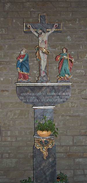 In die Werktagskirche (Kreuzkapelle) übertragen wurde das alte Friedhofskreuz, ein aufwendig gearbeiteter Kreuzigungsbildstock des Rokoko. Die bewegte, vollplastische Kreuzigungsgruppe auf einem ausladenden wuchtigen Tragstein mit Stifterinschrift und Datierung 1759; der kantige Pfeilerschaft mit Konsole. Der für die Mittelmosel typische Kreuzigungsbildstock wurde 1889 und 1976 renoviert und ist jetzt farblich gefaßt. [1]