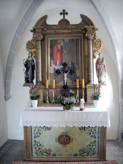 Der einfache hölzerne Säulenaltar d. 18. Jahrhundert zeigt ein großes Mittelbild und seitliche Konsolen für die Figuren der heiligen Apollonia und Gertrud. [3]