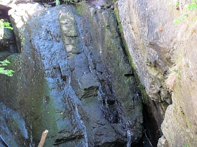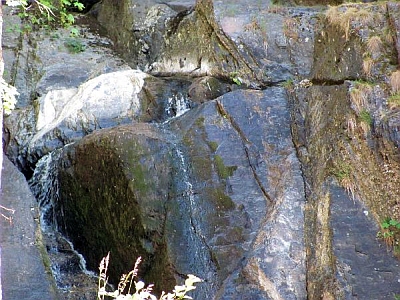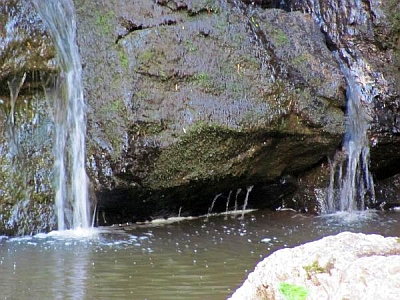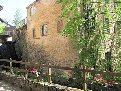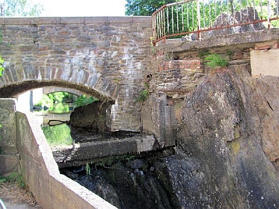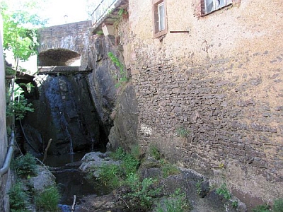 Imposanter Doppelwasserfall, getrennt durch eine Felsnase mit darauf befindlichem Gebäude. Das Wasser der Enz stürzt unmittelbar hinter den beiden Brücken in die Tiefe. [1]