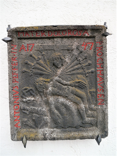 An der Außenwand der Kirche, ein aus Basalt geschaffenes Bildnis der Schmerzhaften Muttergottes, mit der lateinischen Inschrift "Mater Dolorosa - A(nno) 1747 - Antonius Peffer (aus) Prochhausen" (vermutlich der untergegangenen Ort Bruchhausen). [1]