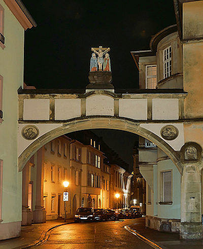 1909 nach Entwurf des Architekten Peter Marx neuerbauter Torbogen an der Stelle eines seit dem 16. Jahrhundert überlieferten Torbogens zur damaligen Domimmunität am Eingang der Liebfrauenstraße. Zusammen mit dem Neubau des Doppel-Mietwohnhauses Nr. 4/4a errichtet, dessen Südfront das Bogenmotiv der Durchfahrt sowohl in der Eingangshalle, als auch in den Schaufenstern aufnimmt und fortführt, wird der Torbogen reizvoll im Wechsel von Putzflächen und Sandsteinfassungen gegliedert.