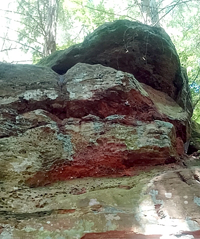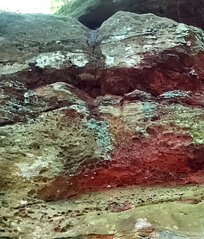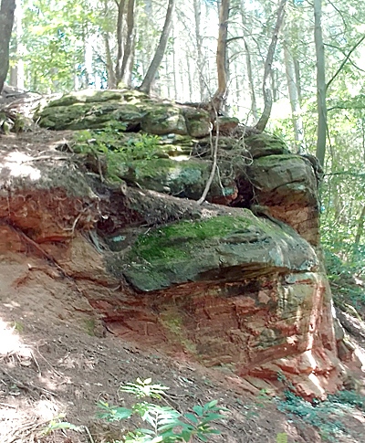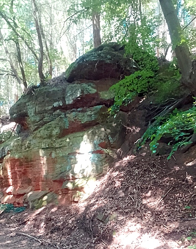 Zu sehen ist an dieser Stelle noch ein mächtiger Buntsandstein-Felsvorsprung mit löchrigen Waben im Gestein, hervorgerufen durch Lösungsverwitterung säurehaltigem Sickerwassers im Sandstein, auch Wabenverwitterung genannt, wie man es sehr häufig in der Trierer-Luxemburger Buntsandsteinfelsenlandschaft erkennen kann. [2]