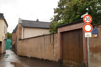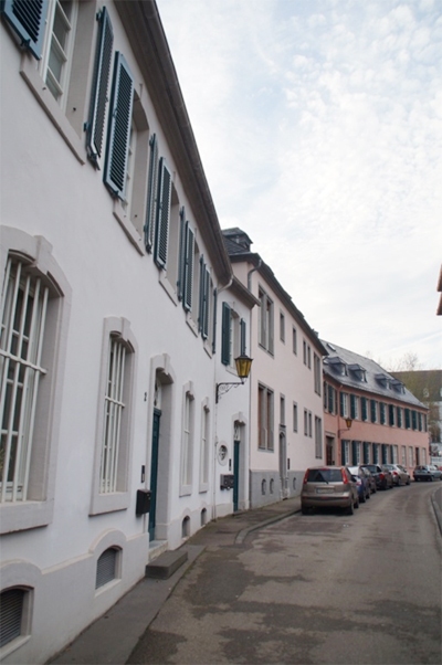 Im Unterschied zum westlichen Abschluß des engen Straßenraums, insbesondere der Umfassungsmauer des alten Banthusseminars und späteren Ursulinenpensionats, wird die gewinkelte Flucht der Ostseite durch eine wohl erst im 19. Und frühen20. Jh. geschlossene Zeilenbebauung bestimmt. Der mehrfach leicht gebrochene Verlauf der Bebauung wird durch eine lückenhafte Reihe historischer Gewölbekeller belegt (Nrrn.1/1a, 4, 5.). [2]