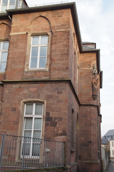 Der kleine, gekrümmte Straßenzug südöstlich vom Dom und Liebfrauenkirche verbindet als Verlängerung der Gasse Hinter dem Dom die Predigerstraße im Norden mit der Mustorstraße im Süden. 1588 bezeichnet als »gassen, daran man zum palast geht«, erhielt der im späten 18. Jh. als »Bantist Gasse« bekannte Straß-enzug seinen Namen nach dem hl. Bant(h)us, einem 634 urkundlich nachgewiesenen trierischen Priester und Eremiten. Durch seinen Namen ist das Gebäude mit dem ältesten erhaltenen Kern in der Straße verbunden, der Banthuskapelle, die auf ein Oratorium des 10. Jh. zurückgeht. Sie ist der einzige aus dem Mittelalter überkommene Bestandteil der mi Nordwesten der Straße gelegenen Banthuskurie, deren im Kern romanisches Hauptgebäude südlich gegenüber der Kapelle 1949/50 abgebrochen wurde. Der alte Kurien- und spätere Seminarbereich auf der seit jeher kaum bebauten westlichen Straßenseite wurde bald nach der Mitte des 19. Jh. von den Ursulinen übernommen, die hier eine höhere Töchterschule einrichteten. Ihr erstes eigenes Schulgebäude, ein dreigeschossiger, 1892/93 nach Plan von Julius Wirtz an der Stelle eines Altbaus errichteter und nach Kriegsbeschädigung nur noch in zwei Geschossen erhaltener, späthistoristischer Bau im Südwesten der Banthusstraße engt noch heute die Einmündung in die Mustorstraße ein (heute Generalvikariat, Hinter dem Dom 6 Bau D).