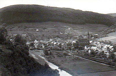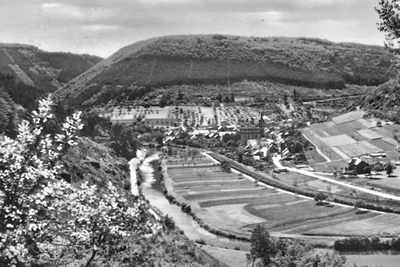 Flur 6 - Sie beschränkt sich mit 2 Flurteilen "Eckenberg" und "Ockenberg" auf einen heute bewaldeten, nur etwa 50 Meter breiten Bergstreifen hinter "Ober der Brücke" bis in die Nähe vom neuen Schwimmbad. Die Kyll bildet mit dem Berghang, den sie anstößt, die "Ecke". Im Eigentum der Dorfleute war auch diese Flur wie die meisten Berghänge ehedem landwirtschaftlich genutzt, was in "Ockenberg" = Ackerberg noch anklingt. Über dem Eckenberg hat früher eine Waldschneise vom Hochmarksweg her einen freien, lustigen Ausblick in das nördliche Kylltal gestattet. Nach dem Besitzer des Grundstückes ist das heute noch als "Schmittesfinsterchen" bekannt. [1]