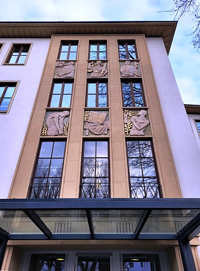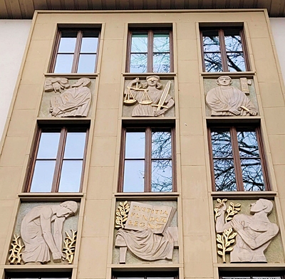 Die sechs Relieftafeln am Landgericht Trier stammen vom Trierer Bildhauer Michael Trierweiler (*1908–1998). Sie weisen auf die Herkunft von Gerechtigkeit und Rechtsprechung hin. Dabei wird nicht nur auf christliche Symbole, wie die zehn Gebote verwiesen, sondern auch auf das Römische Rechtswesen. [1]