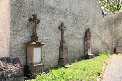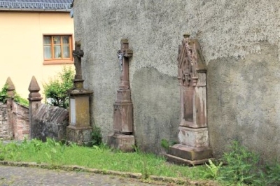 Vor der Scheune, die den Kirchhof nach Nordosten begrenzt, stehen drei Pfarrergrabsteine aus dem späten 19. und frühen 20. Jahrhundert, die beiden älteren in gotisierenden Formen. [1]