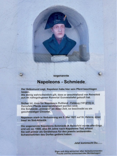 Der Volksmund sagt Napoleon habe hier sein Pferd beschlagen lassen. Als wenig wahrscheinlich gilt, dass er anschließend von Reinsfeld aus im nahegelegenen Ruwertal Gummistiefel gekauft hat. Sicher ist, dass für Napoleons Rußland - Feldzug (1812/13) in Reinsfeld Pferde zwangsrekrutiert worden sind. Die Schmiede "erinnere" an diese Zeit, so beschreibt es ein geschmeidiger Chronist. Napoleon starb in Verbannung am 5. Mai 1821 auf St. Helena, einer Insel im Süd-Atlantik.