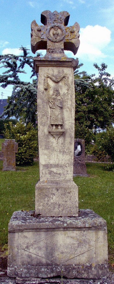 Ursprünglich stand dieses im Empirestil gehaltene Kreuz, das in seiner Art in der näheren Umgebung typisch für die Zeit um 1820 ist, an einem Prozessionsweg, den Pilger aus der Nordeifel jährlich bis nach Trier gingen. Nach Verbreiterungs - und Ausbaumaßnahmen an der B 51, in deren Nähe es früher stand, wurde es mehrmals abgebaut und fand schließlich auf dem alten Friedhof in Newel einen neuen Standort. Der Name "Matthiaskreuz" stammt daher, daß zum Einen der Errichter mit Vornamen Matthias hieß und zum Anderen die Figur des heiligen Matthias mit den Attributen Beil, Buch und Namensbezeichnung auf dem Schaft abgebildet ist, wobei die Abkürzung AP vermutlich für Apostel steht. Wie das IHS - Zeichen und die Wundmale Christi am Kreuz bereits vermuten lassen, handelt es sich hierbei um ein Totengedächtniskreuz, das zur Erinnerung an einen Pilger, der hier einem Herzschlag erlag, aufgestellt wurde. Stifter des Kreuzes waren die Eheleute Matthias und Catharina Feltes, die 1780 heirateten. Sie starb 1839 mit 76 Jahren, er erreichte ein damals ungewöhnlich hohes Alter von 94 Jahren, bevor er 1841 gestorben ist. Die vielen Graffitis am Schaft deuten auf die Menge der Pilger hin, die hier früher vorbeikamen und auf ihrem Weg nach Trier verweilten, um eine gemeinsame Andacht zu halten. [2]