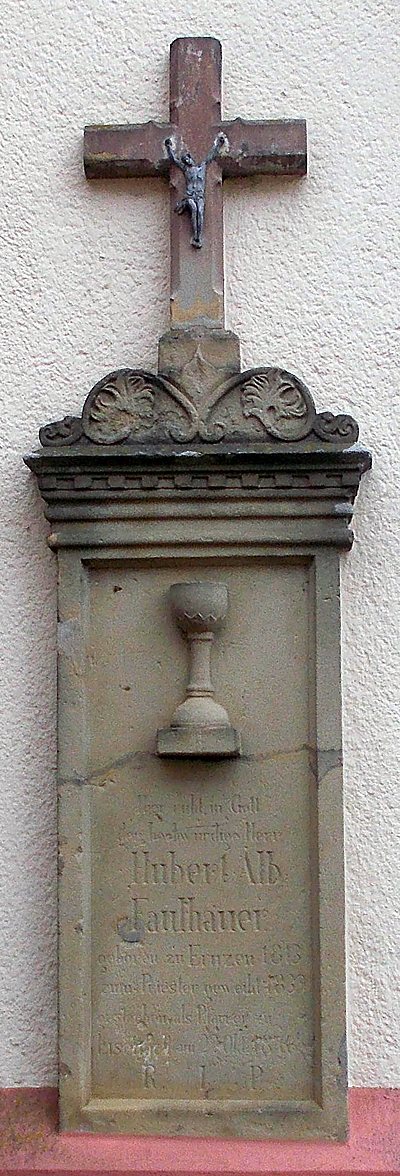 An der Außenwand des Chores befindet sich die Grabtafel des Pfarrers Mattias Ternes (gestorben 1850), an der des Langhauses die für Pfarrer Albert Faulhaber (gestorben 1876). Beide wurden aus dem Vorgängerbau hierher getragen. [1]
